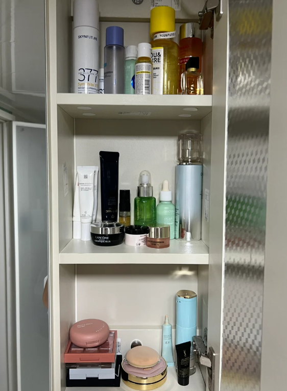 卫生间中的水池子边边和镜柜中,都是会有一些化妆品的存在。